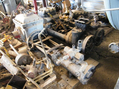 | Here are several other pumps in our collection, all of which came from the same power house as the Allis Chalmers Corliss. Nearest in the picture is an American Marsh Vacuum pump. Behind the American Marsh is a Wagener duplex pump which was used for pumping boiler feedwater - this pump was still in regular use right up to the time we got it. Almost totally hidden in the back is a Union single cylinder pump. |